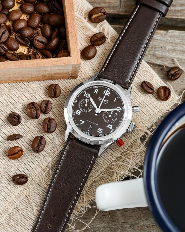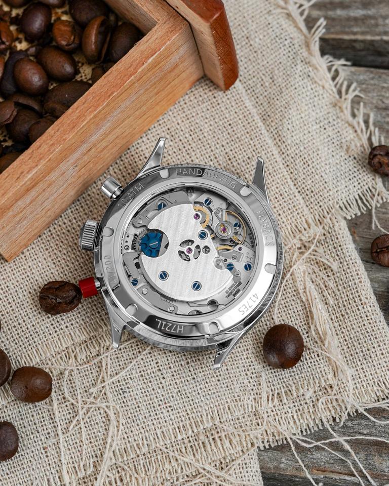 Im Inneren arbeitet das Handaufzugswerk AMT5100 M aus der Manufakturabteilung Manufacture AMT von Sellita – ein klassisches Schaltradkaliber mit Flyback-Funktion, Datum, kleiner Sekunde, 30-Minuten-Zähler und einer Gangreserve von 58 Stunden. Das Werk schlägt mit 4 Hertz (28.800 Halbschwingungen pro Stunde), verfügt über eine Stoßsicherung (shockproof) und wird in der Hanhart-Manufaktur sorgfältig reguliert – mit einer Ganggenauigkeit von 0 bis +8 Sekunden pro Tag. Robust, präzise und gebaut für Enthusiasten, die mechanische Perfektion lieben.